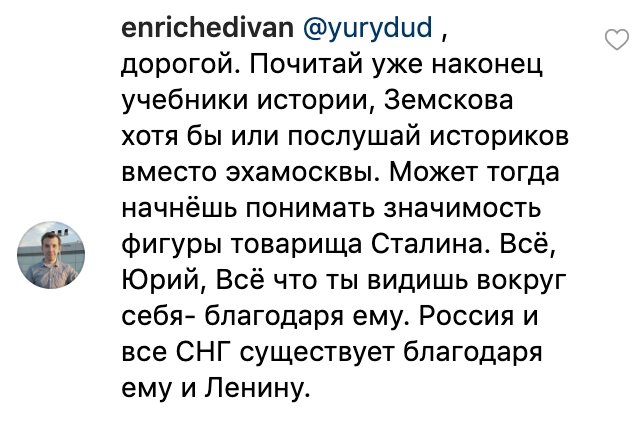 В то же время нашлись и те, кто новый выпуск «вДудя» не оценили, назвав его поверхностным. Среди негативных комментариев были и такие, в которых люди либо полностью опровергали сказанное автором, либо просто советовали журналисту почитать учебники истории.