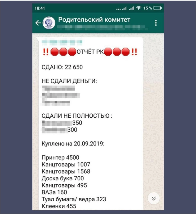На первом родительском собрании комитет принял решение собрать по 1200 рублей на нужды класса. Ольга сдала эти деньги. Однако спустя несколько дней в чате родительского комитета появилась информация, что нужно сдать еще. На собранные деньги был куплен принтер и кулер, но появились «непредвиденные расходы».