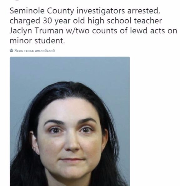 Следователи американского штата Флорида задержали 30-летнюю преподавательницу средней школы Жаклин Трумен и предъявили ей обвинения в развратных действиях по отношению к несовершеннолетней ученице.