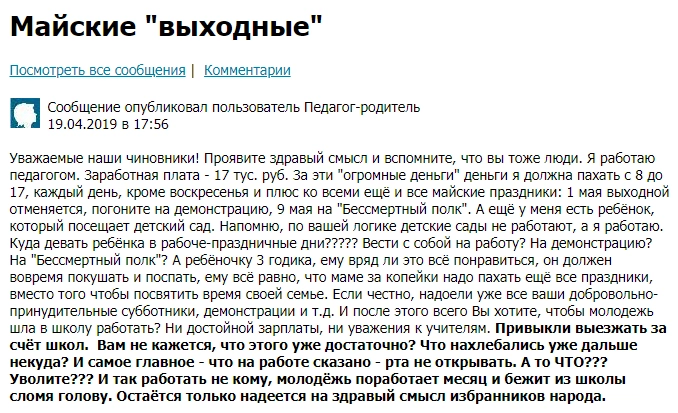 Я работаю педагогом. Заработная плата — 17 тысяч рублей. За эти „огромные деньги“ я должна пахать с 8 до 17, каждый день, кроме воскресенья, и плюс ко всему еще и все майские праздники. 1 мая выходной отменяется, погоните на демонстрацию, 9 мая — на „Бессмертный полк“, — написала учительница.
