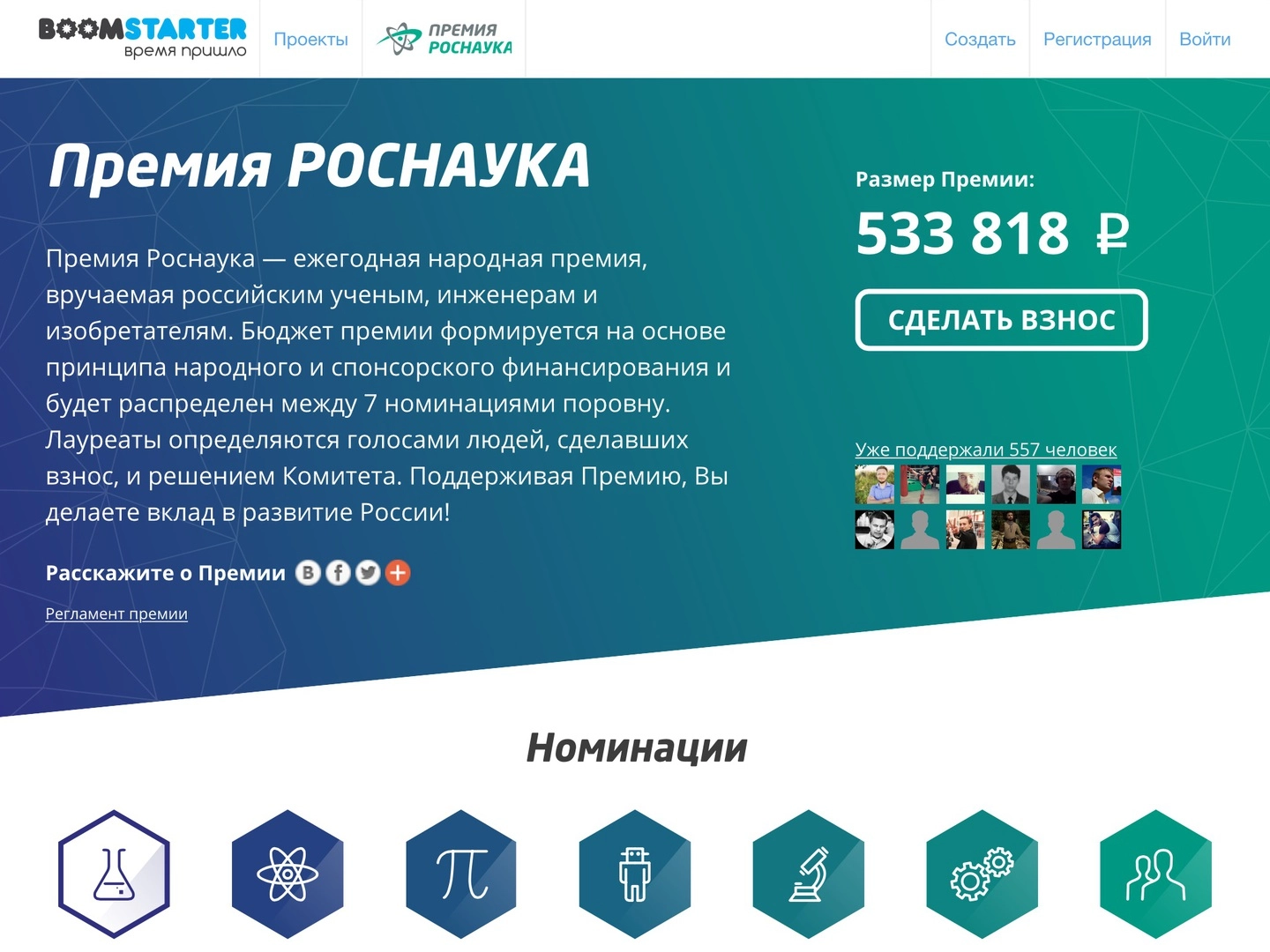 Идея запуска народной поддержки научной индустрии реализуется на крупнейшей в России краудфандинговой площадке Boomstarter, где создана страничка «Роснаука», на которой можно выдвигать лауреатов, делать взносы и следить за собранной суммой.