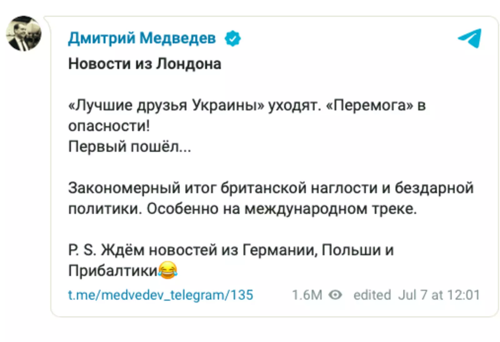 «Клоун уходит… Близкий друг и покровитель Зеленского премьер Британии Борис Джонсон вынужден покинуть свой пост. Сохраниться, несмотря на все потуги и усилия, у него не получилось. Борис Джонсон стоит за обстрелами наших мирных городов — Белгорода, Курска. Подданные Британии должны это знать. Он — один из главных идеологов войны против России до последнего украинца. Правильно лидерам европейских государств задуматься, к чему приводит такая политика».