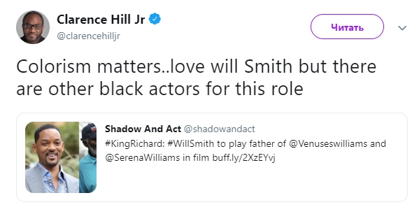Дело в том, что все единодушно считают, что Смит недостаточно темнокожий, чтобы создать образ Ричарда Уильямса.