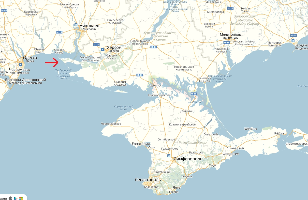 Скриншот карты. Стрелка указывает на полуостров, называвшийся Ягорныцкий Кут в Херсонской области Украины