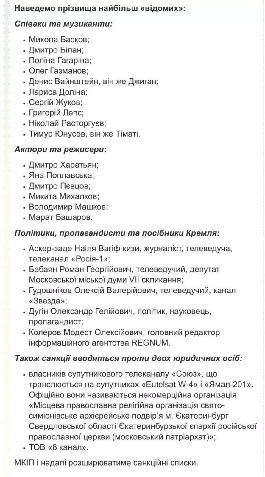 «Министерство культуры и информационной политики предложило дополнить санкционный список. [В него попадают] певцы и музыканты: Николай Басков, Дмитрий Билан, Полина Гагарина, Олег Газманов, Денис Вайнштейн, он же Джиган, Лариса Долина, Сергей Жуков, Григорий Лепс, Николай Расторгуев, Тимур Юнусов, он же Тимати», — говорится в сообщении ведомства в соцсетях.