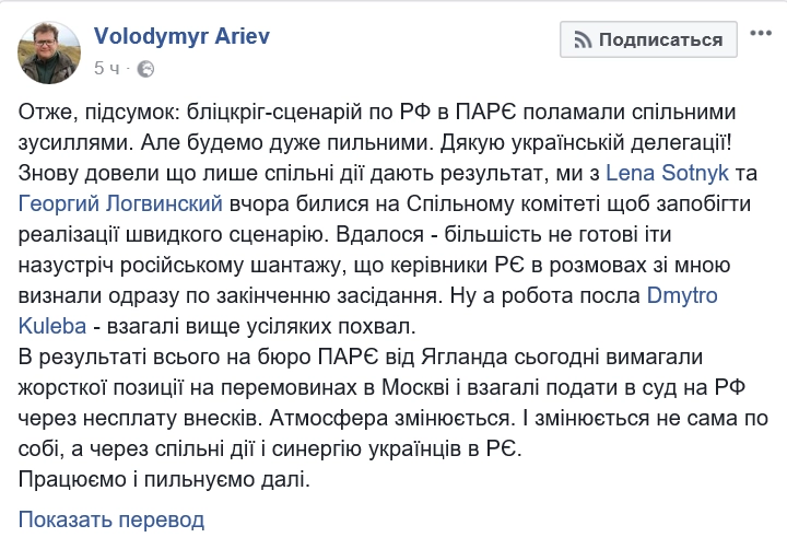 «На бюро ПАСЕ от Ягланда сегодня требовали жесткой позиции на переговорах в Москве и вообще подать в суд на РФ за неуплату взносов. Атмосфера меняется. И меняется не сама по себе, а через совместные действия и синергию украинцев в Совете Европы. Работаем и следим дальше», — написал глава украинской делегации, депутат Верховной рады Владимир Арьев на своей странице в Facebook.