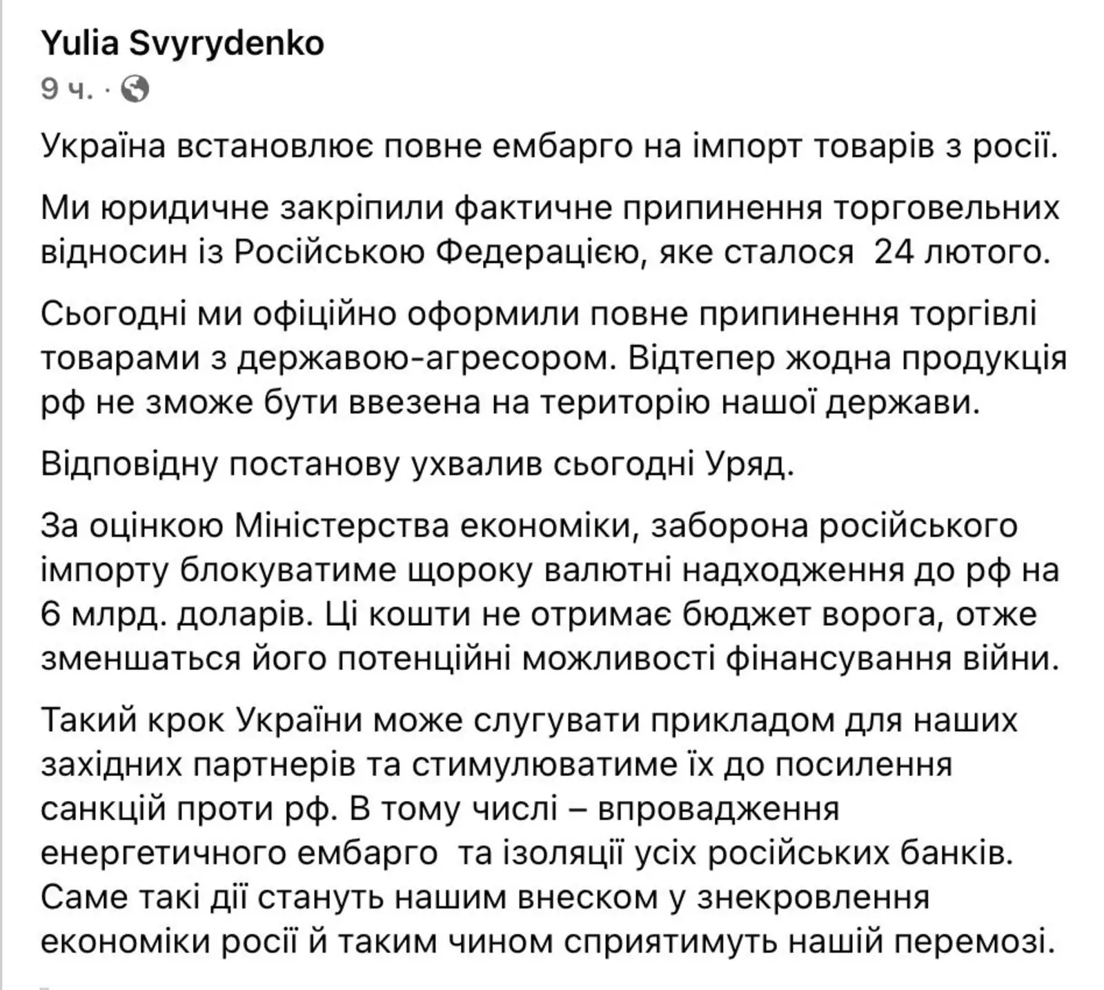 «Введено торговое эмбарго против РФ. Запрещен импорт на таможенную территорию Украины товаров из России», — сообщил представитель кабмина в Верховной раде Тарас Мельничук.