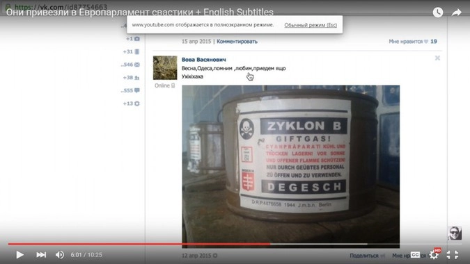 «Весна, Одеса, помним, любим, приедем ящо Ухixixaxa», — подписал картинку Васянович. Ниже изображена банка с газом «Циклон Б», который активно использовали фашисты в концентрационных лагерях.