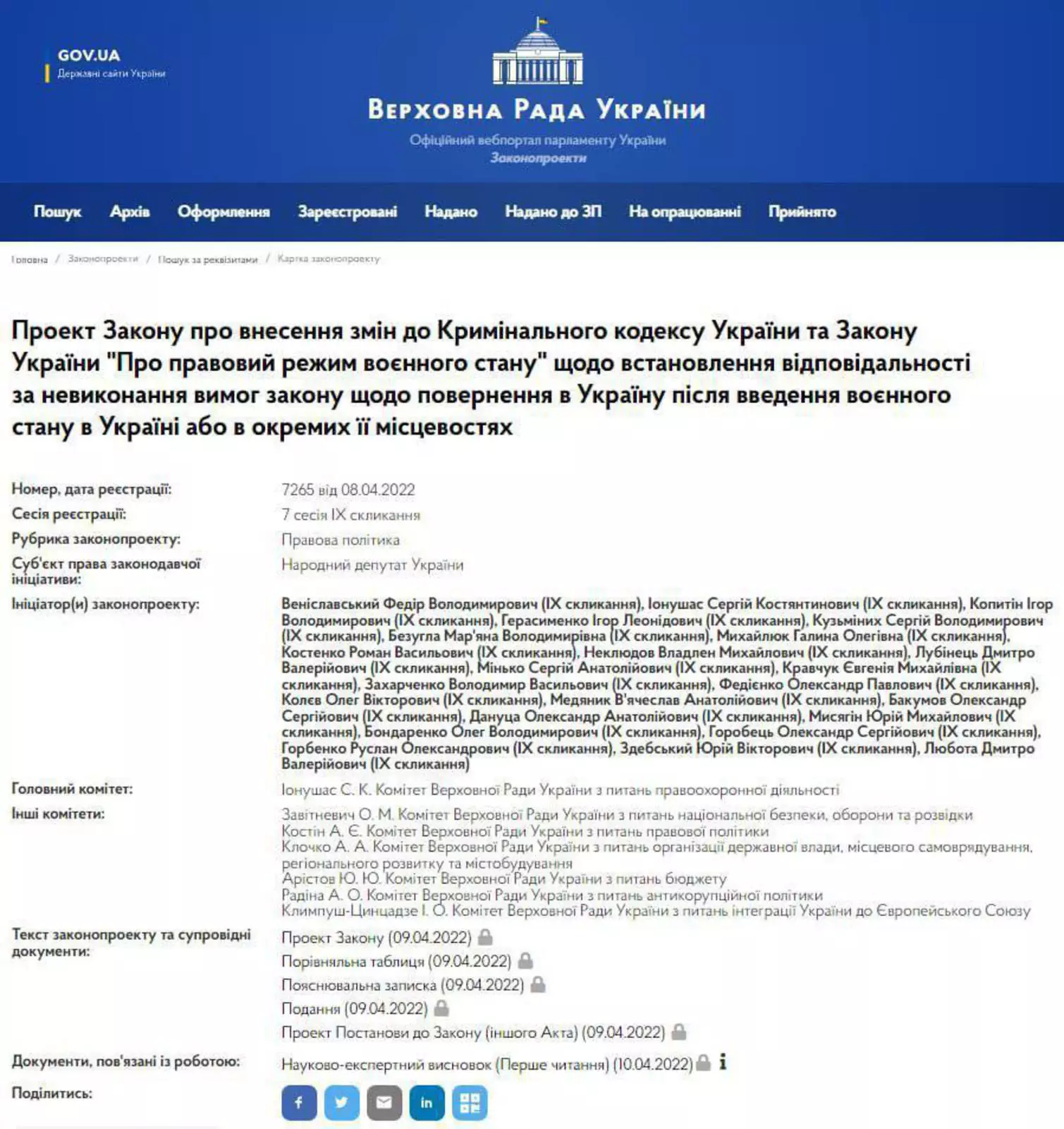В документе предлагается обязать подлежащих мобилизации украинцев, находящихся за границей, возвращаться на Украину во время военного положения. За неисполнение указанной нормы в течение 15 дней предусматривается уголовная ответственность до 10 лет заключения.