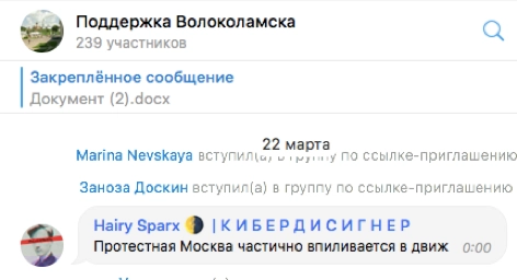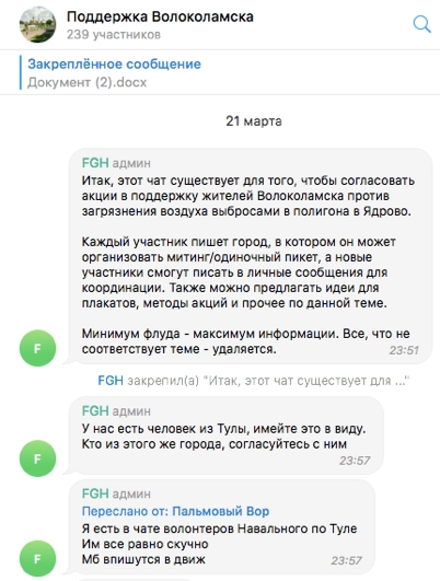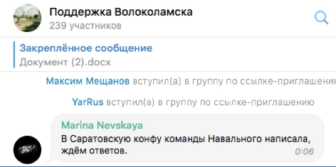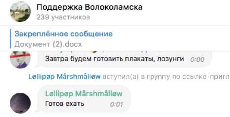Судя по фрагментам переписки чата «Поддержка Волоколамска» в Telegram, обсуждают готовящиеся акции вовсе не местные активисты, а представители оппозиции из других городов — и даже стран. Главное на повестке дня — создание нужной «картинки» для федеральных СМИ, организация подвоза протестующих из других городов, а также использование покрышек и перекрытие дороги.