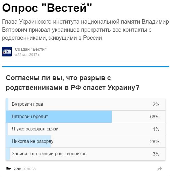 Большинство же просто пришли к выводу, что глава Института национальной памяти бредит. Такое мнение распространено не только в соцсетях: например, читатели украинского издания «Вести» также большинством голосов поставили украинскому радикалу психиатрический диагноз.