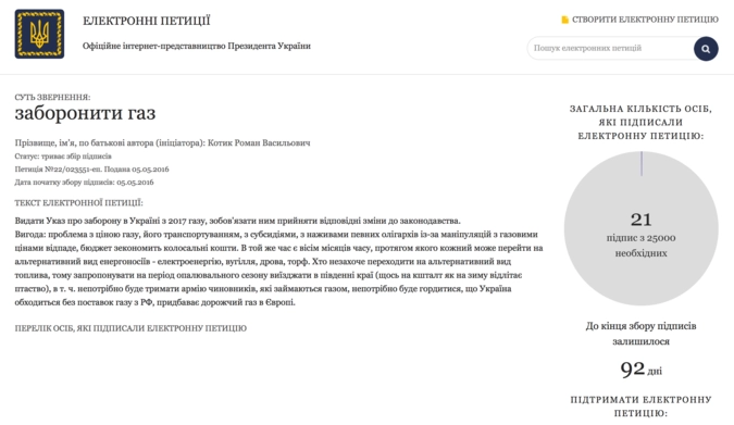 На момент опубликования этого материала петицию подписало «невообразимое» число граждан — 21. Чтобы документ рассмотрел Петр Порошенко, за 92 дня ее должны подписать 25 тысяч человек.