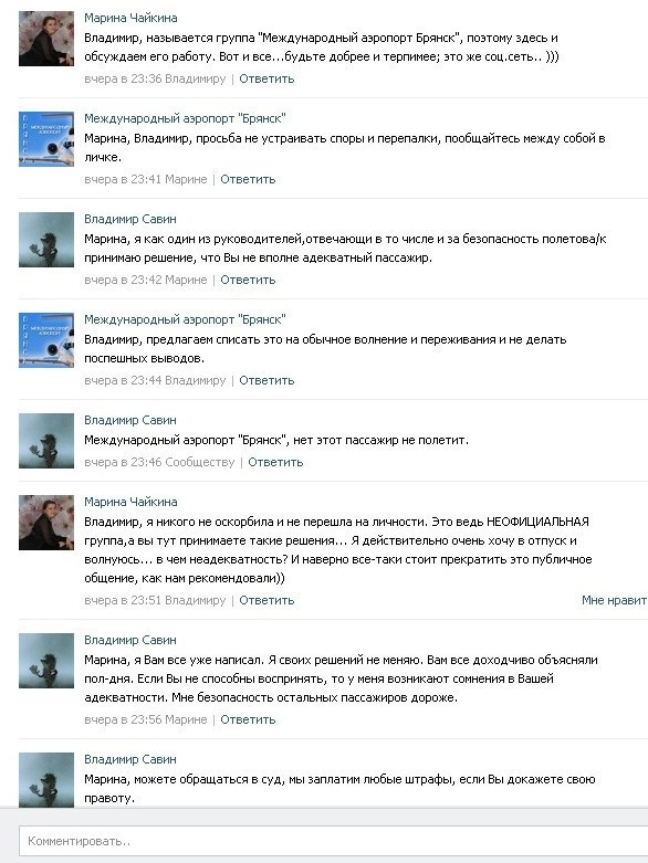 В неофициальном паблике брянского аэропорта пассажиры завели речь о качестве работы воздушной гавани. И вот в комментариях к одной из записей между пользователями разгорелся спор. В результате некий мужчина под именем Владимир Савин, представившийся сотрудником аэропорта, заявил, что не допустит на рейс женщину, которая нелестно отзывалась о качестве представляемых услуг.