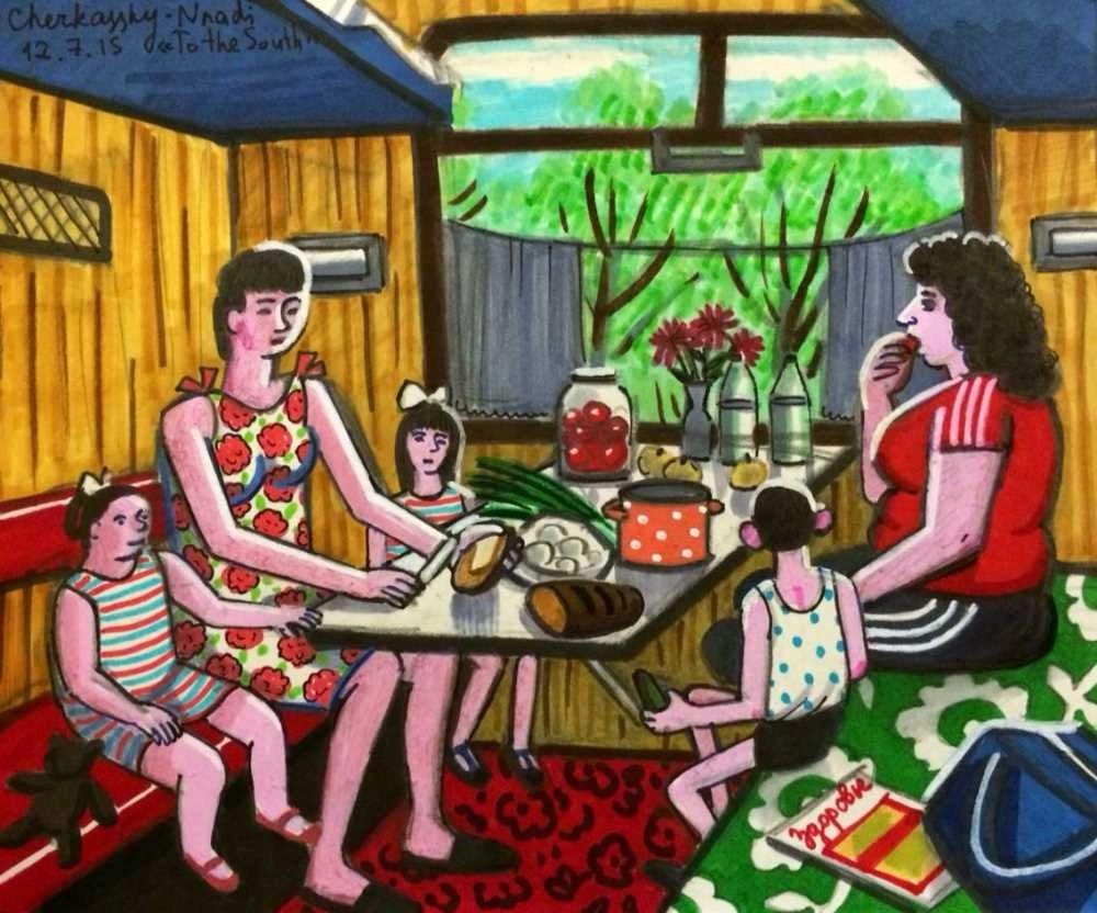 Зоя Черкасская (Zoya Cherkassky-Nnadi) в 15 лет переехала в Израиль из Киева и там начала рисовать свои детские воспоминания о Советском Союзе. Её работы сразу получили любовь публики и похвалу критиков. Картины изображают особенности быта советских семей, предметы мебели, одежду, любимые телешоу, сцены из жизни, традиции, праздники, памятные детали, и каждая из них наполнена особым теплом и душевностью. Работы Зои Черкасской часто выставляются в израильских художественных галереях и неизменно получают высокие оценки. Собрали для вас подборку рисунков, которые непременную вызовут приступ ностальгии и найдут отклик в душе у целого поколения людей, выросших в СССР.