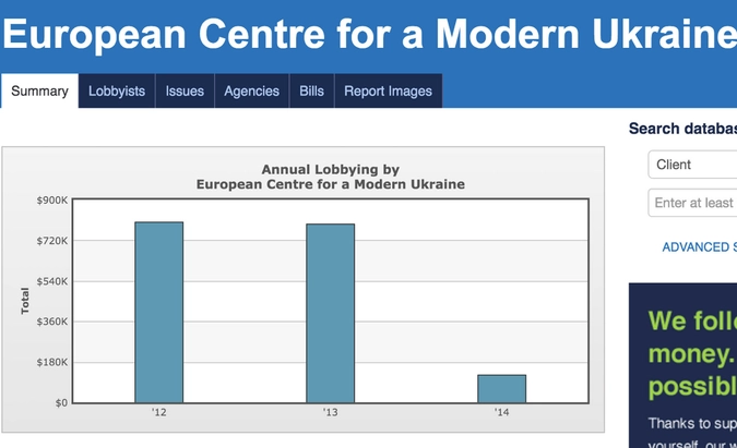 Основатель «Европейского центра современной Украины» не упускал возможности напомнить о недостаточном финансировании НКО, однако в период с 2012 по 2014 года организация тратила на лоббирование интересов Украины и формирование ее положительного имиджа в Европе и США весьма солидные средства. Согласно данным сайта opensecrets.org, в 2012 году сумма составила $800 000, в 2013 году — $790 000, а уже через год — еще $120 000.