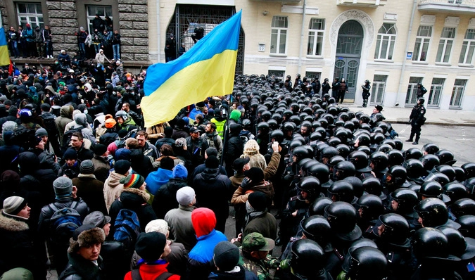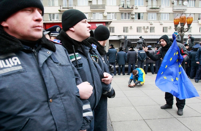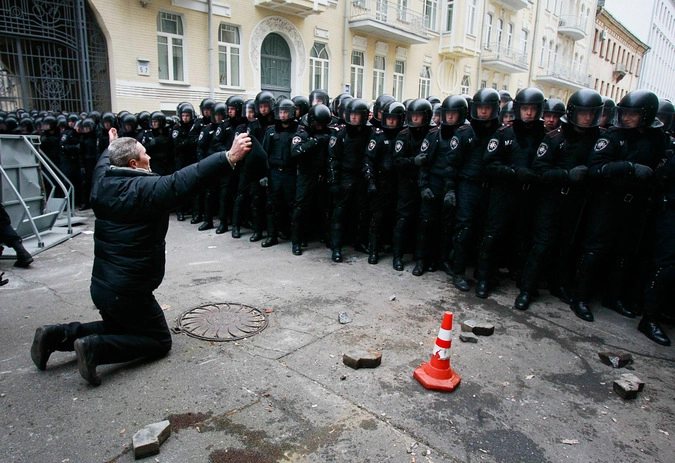 16:30 В попытках прорыва на территорию президентской администрации оппозиционеры используют экскаватор. Около здания собралось несколько тысяч человек, намеренных преодолеть полицейское оцепление. Подступы к администрации, в свою очередь, заблокированы автобусами и шеренгой спецназовцев «Беркута», в которых летят палки, бутылки и файеры.