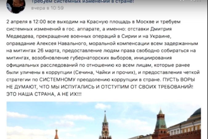 Организатор данного сообщества призывал всех «неравнодушных граждан» выйти 2 апреля к московскому Кремлю и устроить очередной незаконный митинг против российской власти, используя в том числе и повестку Навального.