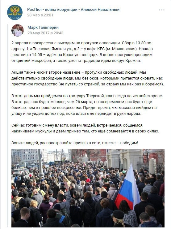 Информацию о митинге подхватил одиозный политический активист Марк Гальперин. Он разразился целым постом, призвав «всю оппозицию» выйти на Красную площадь, чтобы затем сменить власть. Текст Гальперина тоже был опубликован в группе «РосПил», не имеющей отношения к Алексею Навальному и его фонду.