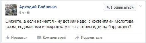 В этот же омут нырнул и журналист Аркадий Бабченко, который не так давно эмигрировал в Чехию. «Скажите, а если начнется — ну вот как надо, с коктейлями Молотова, газом, водометами и покрышками — вы готовы идти на баррикады?» — пишет он в своем Facebook.