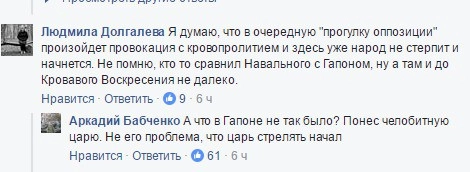 «Я думаю, что в очередную „прогулку оппозиции“ произойдет провокация с кровопролитием и здесь уже народ не стерпит и начнется. Не помню, кто-то сравнил Навального с Гапоном (один из организаторов шествия петербургских рабочих к Зимнему дворцу 9 января 1905 года, которое закончилось расстрелом протестующих), ну, а там и до „Кровавого Воскресения“ не далеко», — ответила на запись Бабченко некая Людмила Долгалева из Сургута.