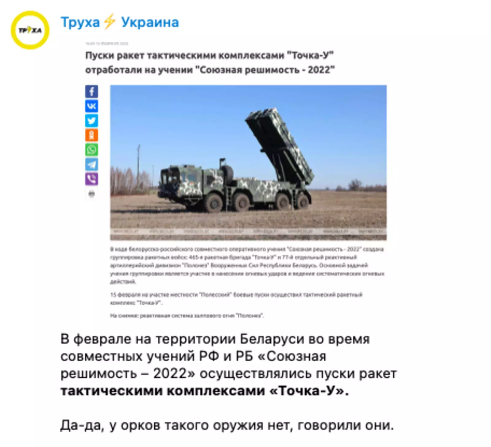 В украинских пабликах пишут, что Россия на самом деле активно использует подобные комплексы, хотя они и были сняты с вооружения ВС РФ еще в 2019 году. В качестве аргумента авторы таких сообщений приводят участие расчётов «Точек-У» в совместных учениях России и Белоруссии «Союзная решимость — 2022».