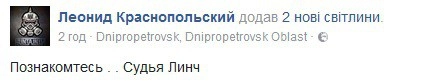 Первым фотографии Аллы Бандуры опубликовал на своей странице в Facebook украинец и активный сторонник «АТО» Владимир Краснопольский в минувшие выходные. «Познакомьтесь… Судья Линч», — написал он под фото. Помимо прославившегося снимка он публиковал еще один, на котором судья была без яркой косметики.