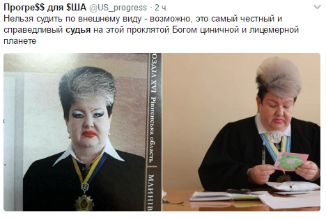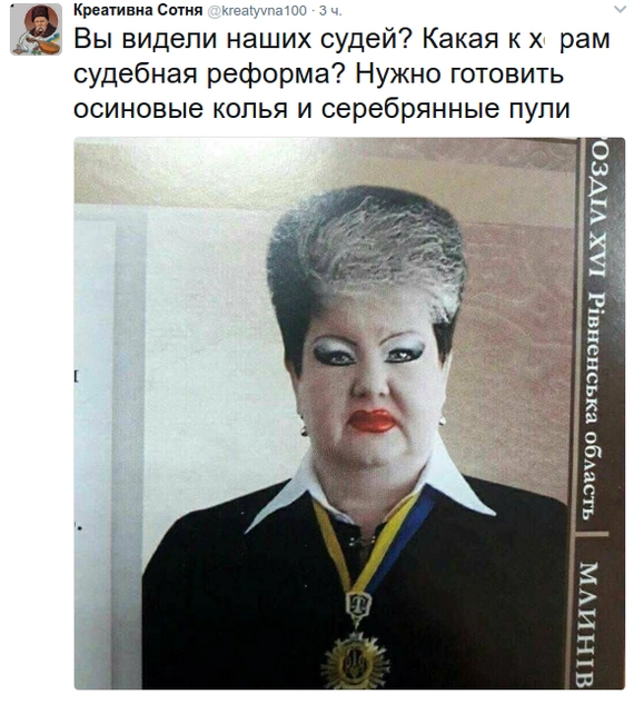 Судья из Украины Алла Бандура прославилась в соцсетях благодаря незаурядному подходу к собственной внешности. Украинские пользователи даже окрестили судью с поразительным макияжем «истинным лицом судебной реформы» и шутят, что с помощью этого фото будут пугать детей.