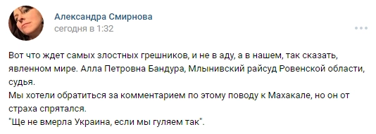 Когда фотография разлетелась по Сети и стала претендовать на роль нового мема, украинские активисты раскопали больше сведений из биографии судьи. «Декларация: квартира в Млинове — 80 квадратов. Авто нет. Четвертый год гасит какие-то небольшие кредиты. В начале 2000-х из-за какого-то дела к ней домой пришли два выродка. Двенадцать колото-ножевых ран заточкой. Еле осталась живой», — написал один из пользователей, отметив моральные качества женщины, которая после такого жуткого случая нашла в себе силы вернуться к работе.
