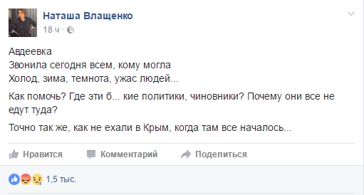 Украинская журналистка Наталья Влащенко обвинила власти в бездействии на фоне эскалации боевых действий на Донбассе. Свое возмущение телеведущая телеканал «112» высказала на странице в Facebook: «Авдеевка. Звонила сегодня всем, кому могла. Холод, зима, темнота, ужас людей… Как помочь? Где эти б… кие политики, чиновники? Почему они все не едут туда? Точно так же, как не ехали в Крым, когда там все началось…»