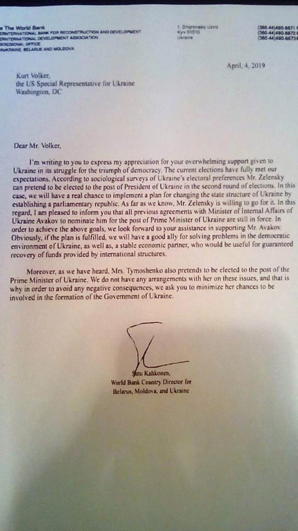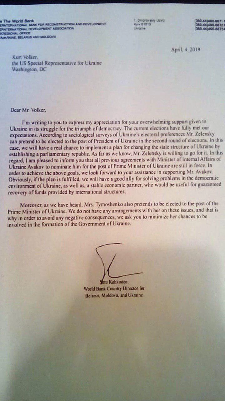 Так называемый «Союз блогеров Украины» опубликовал копию появившегося в их распоряжении письма директора регионального направления World Bank Сату Кахконен спецпредставителю США по Украине Курта Волкера. В послании говорится, что президент Украины Владимир Зеленский имеет некие договоренности с американскими партнерами о выдвижении на пост премьер-министра страны нынешнего главы МВД Арсена Авакова.
