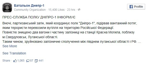 Пресс-служба полка Днепр-1 вчера взяла ответственность за террористический акт, совершенный в ночь на 22 января на железной дороге в Луганской области.