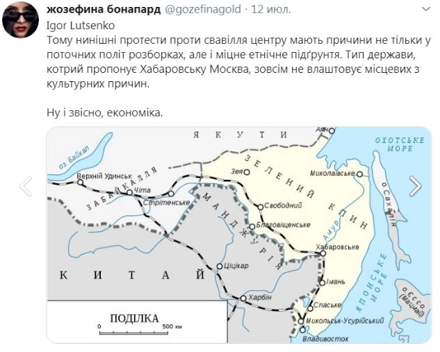 Кроме того, украинцы, раздувшие на основе этих домыслов информационную шумиху в интернете, утверждают, что протесты, которые сейчас организовывают в Хабаровске, свидетельствуют о пробуждении кода нации и служат доказательством тому, что жители города — истинные украинцы, устроившие майдан.