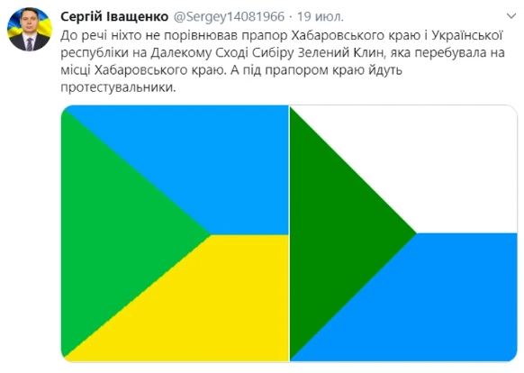 Некоторые даже делают акцент на якобы украинских названиях городов этого региона и требуют присоединить Хабаровский край к Украине, обращая внимание на схожесть их флагов. Однако не стоит забывать, что подобное сходство можно обнаружить между российским и французским флагами.