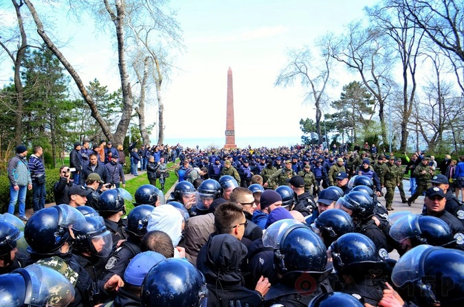 Едва начались первые стычки, в конфликт вмешалась полиция, поэтому до полноценной драки не дошло. Полиция взяла в кольцо украинских радикалов, которые пытались спровоцировать толпу, и стали оттеснять их от участников мероприятия в честь освобождения Одессы. Особо агрессивных активистов правоохранители жестко задерживали.