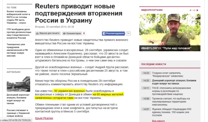 Возможно, кто-то даже не уловил глубины этой мысли: 30 украинских военнопленных, захваченных сепаратистами были освобождены сепаратистами в обмен на 60 мирных жителей, захваченных сепаратистами.