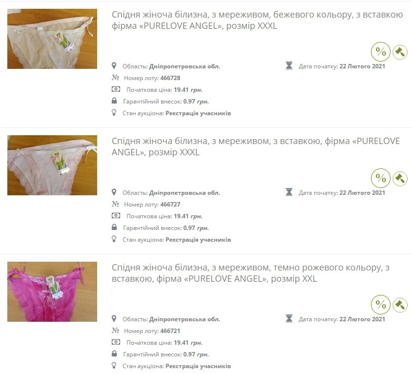 И похоже, что это не единственный экземпляр выставленных на торги трусов: по данным СЕТАМ, 22 февраля на криворожском аукционе будут проданы 32 аналогичных предмета женского туалета. Предполагается, что 19 февраля с молотка уйдут еще двое трусов.