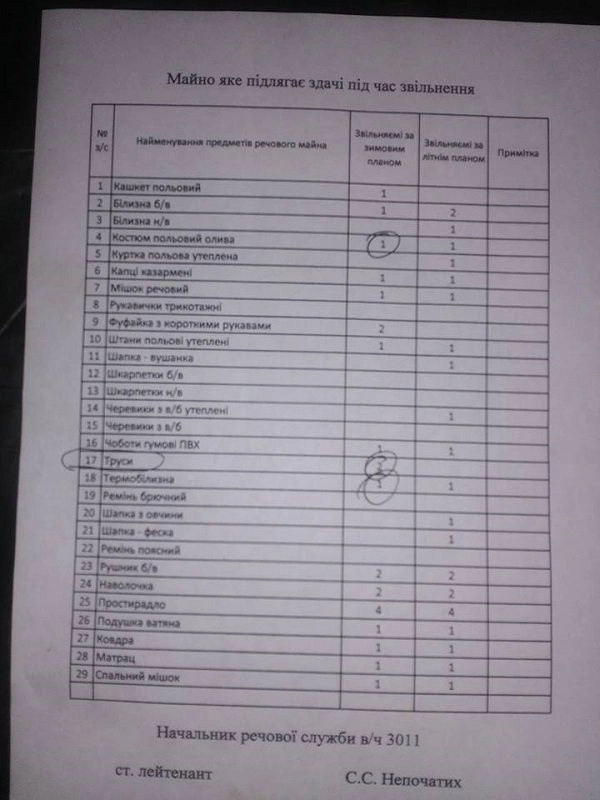 В списке вещей, которые необходимо будет сдать в воинскую часть после года службы на взводно-опорных пунктах в зоне проводимой украинскими военными операции в Донбассе, неожиданно оказались даже трусы.
