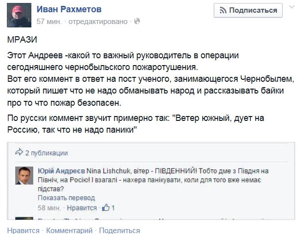 «Ветер южный, дует на Россию, так что не надо паники», — написал в комментарии под постом одного ученого в Facebook некто Юрий Андреев, которого называют «важным руководителем в операции чернобыльского пожаротушения».