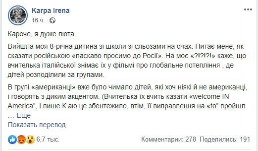 Оказывается, на уроке по итальянскому языку ее дочь определили в группу с русскими. Кроме того, учительница назвала русских и украинцев «одним и тем же» народом.