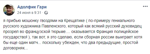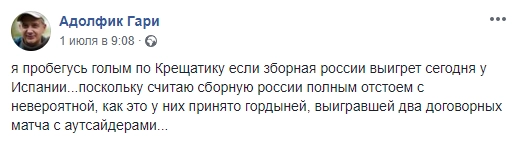 Украинский писатель Адолфик Гари заявил, что прыгнет с моста, если сборная России по футболу победит хорватов в четвертьфинале ЧМ-2018.