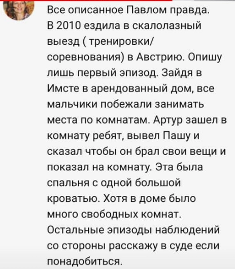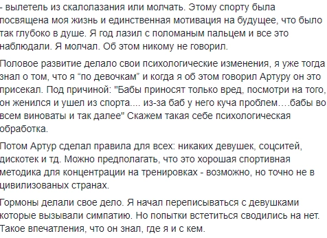 Павел Векла, скалолаз с Украины, опубликовал на своей странице в Facebook рассказ о том, как в течение восьми лет подвергался сексуальному насилию. Своим обидчиком Векла называет Артура Печия — тренера национальной сборной по скалолазанию.