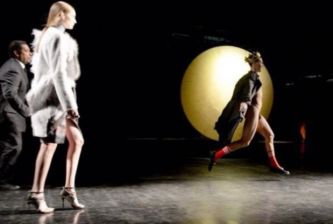 Инцидент произошел во время показа коллекции Prabal Gurung. Седюк в стрингах, пальто и короне выскочил на сцену, добежал на одной из моделей и опустился перед ней на колени.