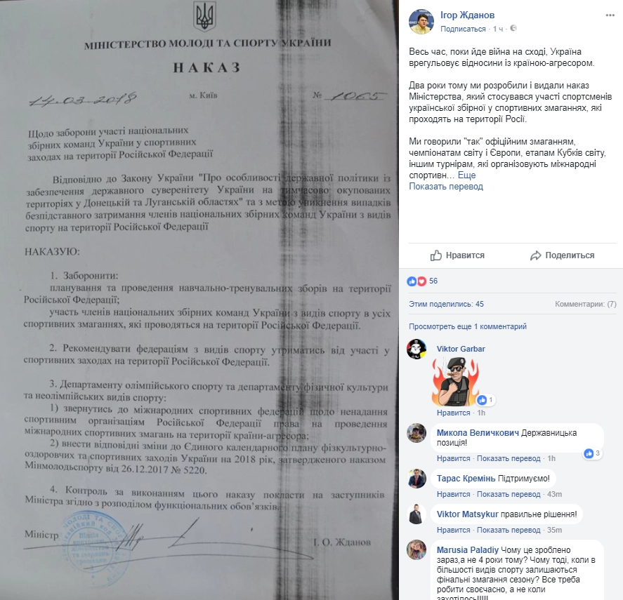 Министр молодежи и спорта Украины Игорь Жданов подписал приказ, запрещающий украинским спортсменам участвовать в любых соревнованиях на территории России.