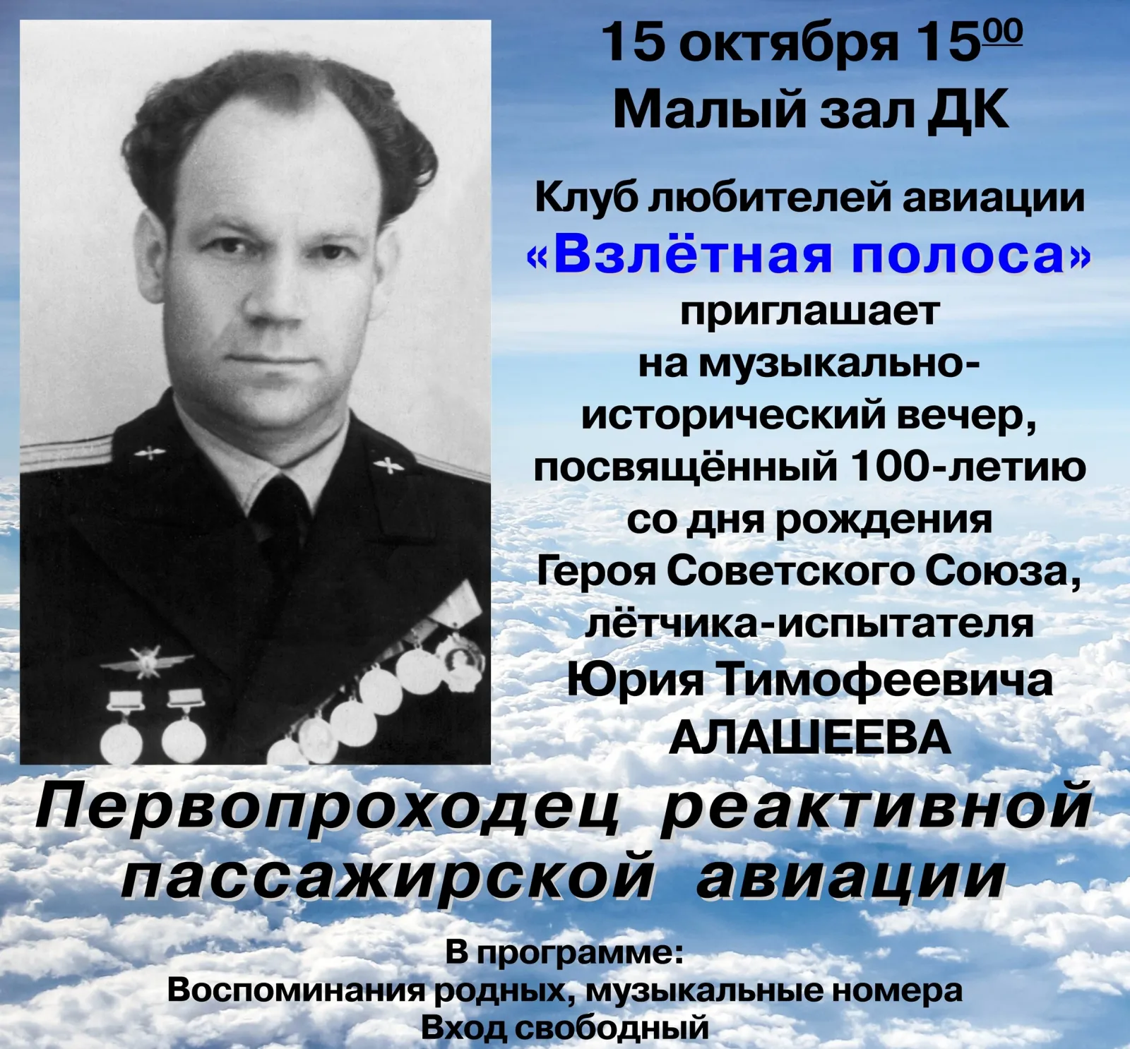 В октябре исполнилось 100 лет со дня рождения Героя Советского Союза летчика испытателя 1-го класса Юрия Тимофеевича Алашеева. Он первым поднял в воздух первый советский реактивный пассажирский самолет Ту-104 и первый советский дальний сверхзвуковой бомбардировщик Ту-22 конструкции ОКБ Андрея Николаевича Туполева, предназначенного для замены бомбардировщика Ту-16.