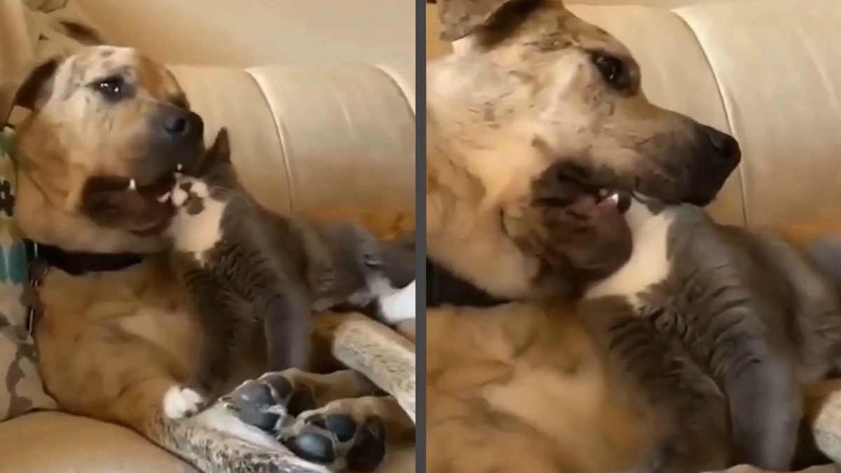 Укротитель псов: кот, засовывающий голову в пасть собаке, напугал Сеть