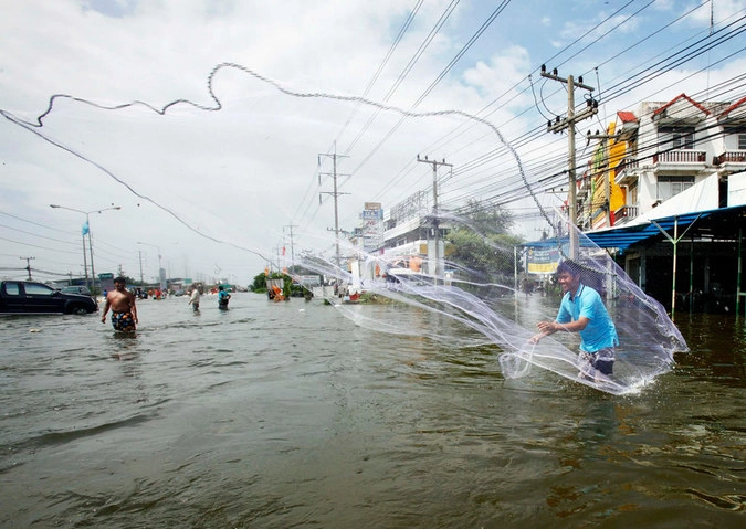 Рыбак забрасывает сети в затопленном поселении в провинции Аюттхая 10 октября 2011 года. Последнее наводнение в Таиланде стало самым сильным за полвека. Значительная часть страны затоплена, фабрики закрыты, а люди остались без средств к существованию. Таиландские спасатели делают все, чтобы не допустить гуманитарной катастрофы.