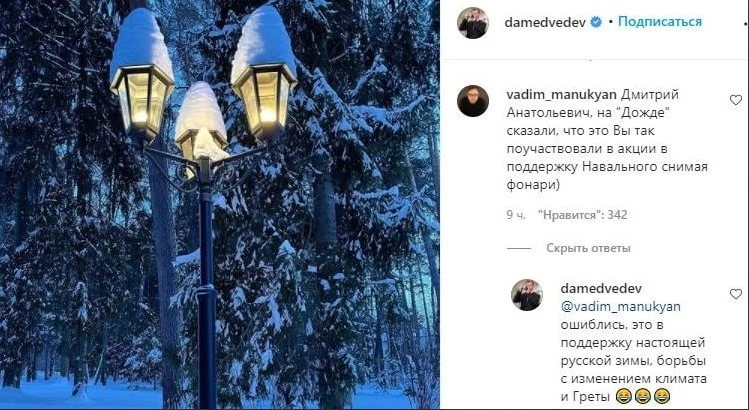 Зампредседатель Совбеза России Дмитрий Медведев объяснил публикацию фотографии с фонариками в своем аккаунте в Instagram. Пользователи заподозрили его в лояльности к сторонникам арестованного Алексея Навального, которые призвали всех сочувствующих оппозиционеру выйти в День влюбленных во двор и зажечь фонарики в знак солидарности.