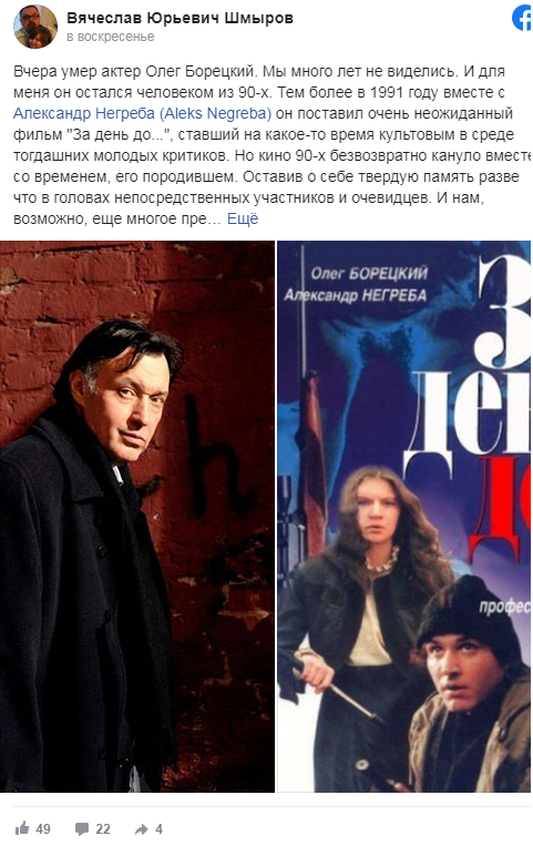 Умер актер Олег Борецкий. Мы много лет не виделись. И для меня он остался человеком из 90-х. Тем более в 1991 году вместе с Александром Негребой он поставил очень неожиданный фильм „За день до…“, ставший на какое-то время культовым в среде тогдашних молодых критиков. Но кино 90-х безвозвратно кануло вместе со временем, его породившим. Оставив о себе твердую память разве что в головах непосредственных участников и очевидцев. И нам, возможно, еще многое предстоит пересмотреть и переоценить из этого недавнего прошлого. В том числе и эту картину, которая, кстати, дала хороший старт целому поколению молодых актеров, — написал Шмыров.