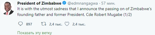 С бесконечной печалью я должен сообщить, что от нас ушел отец-основатель и первый президент Зимбабве Роберт Мугабе, — объявил Мнангагва в своем Twitter.