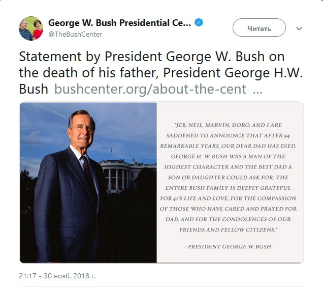 После 94 выдающихся лет наш дорогой отец скончался. Джордж Буш-старший был человеком с очень сильным характером и лучшим отцом, о котором сын или дочь могут мечтать, — написал в Twitter Джордж Буш-младший.